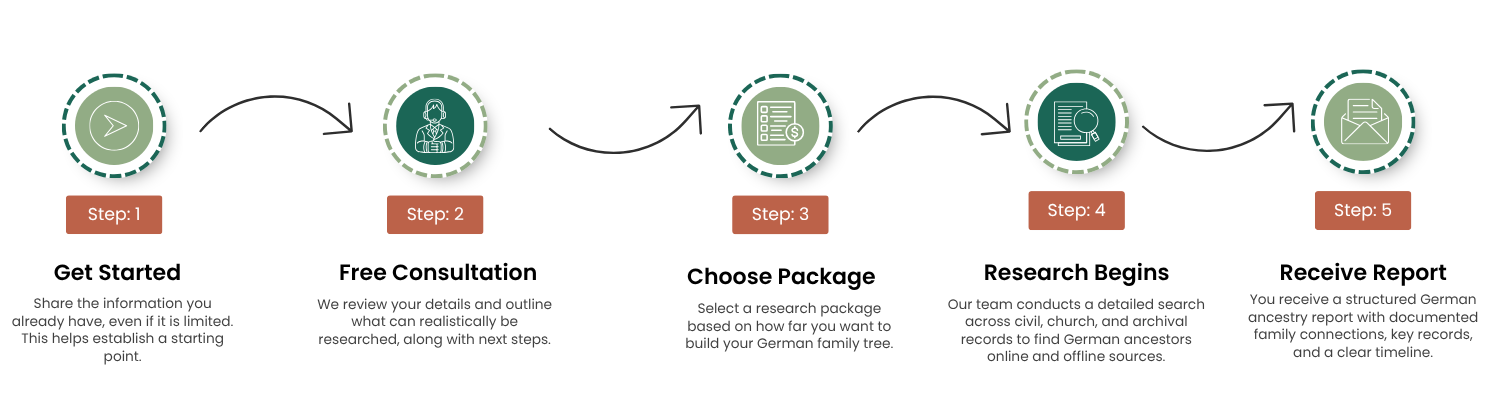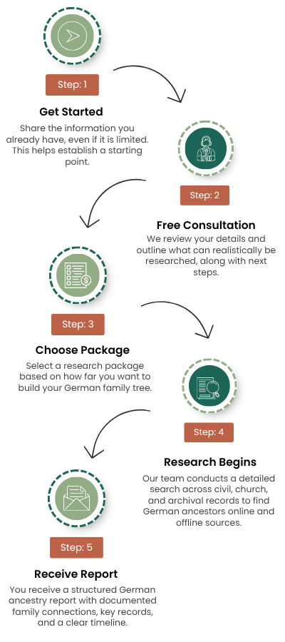 Our researchers access church books, civil registers, and regional archives to build a verified German family tree. The result is a clear, documented account of your ancestry, grounded in records and handled with care.
